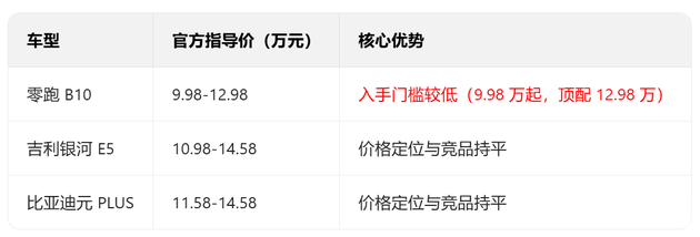 首先咱们对比一下价格:零跑 B10 官方指导价 9.98-12.98 万元,吉利银河 E5 官方指导价 10.98-14.58 万元,比亚迪元 PLUS 官方指导价 11.58-14.58 万元。这三款车的价格定位相近,但入手门槛方面,零跑 B10 是较低的 —— 比如仅需 9.98 万元裸车价,就能入手其低配车型;若追求更高配置,其顶配车型也仅需 12.98 万元。从价格上看,确实,零跑 B10 更适合一些预算有限的家庭用户。