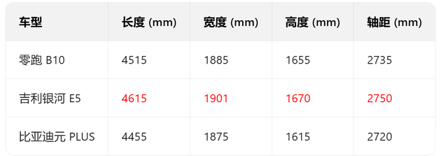 简单对比一下这三款车的车身尺寸:尺寸表现相对突出的是吉利银河 E5,其长度、宽度、高度在三者中均处于偏上水平;轴距在三者中也处于偏上水平的是吉利银河 E5,但三款车的轴距都在 2 米 7 左右,差距仅 10 毫米左右,对车内空间的影响并不大。尺寸处于中等水平的是零跑 B10,尺寸相对紧凑的是比亚迪元 PLUS。