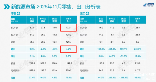 乘联分会最新数据显示,11月国内新能源乘用车市场零售量为132.1万辆,同比增长4.2%,新能源市场零售渗透率达到59.3%。