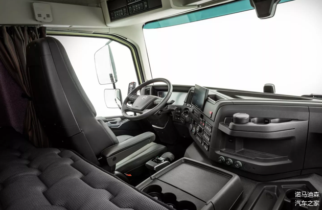 “征途者V”的驾驶室不仅具备操作空间,同时还具备一定的生活属性。驾驶室后排带有一个单人卧铺,方便主副驾驶员在旅途中交替临时休息。对于跨省、跨区域的长途行程,这种结构能够有效缓解驾驶者疲劳,保持充足精神状态。主、副驾座椅以气垫加可调节颈部装置的组合让驾驶员随时保持舒适的工作状态。真皮座椅还有打孔设计,提升了透气性,夏季乘坐更加舒适。主驾驶座椅具有加热通风功能,副驾驶座椅具有加热功能。中间座椅可折叠,没有乘坐需求时折叠起来可以当一个小餐台使用。