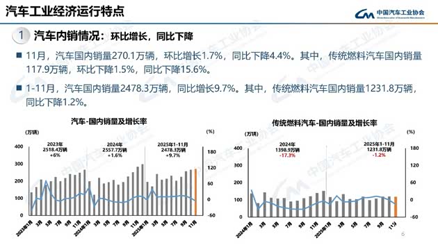 乘用车内销方面,11月乘用车国内销量241.4万辆,环比增长1%,同比下降6.5%。其中,传统燃料乘用车国内销量98.9万辆,比去年同期减少22.1万辆,环比下降2.4%,同比下降18.3%;1-11月,乘用车国内销量2186万辆,同比增长9.8%。其中,传统燃料乘用车国内销量1014.5万辆,比去年同期减少11.2万辆,同比下降1.1%。