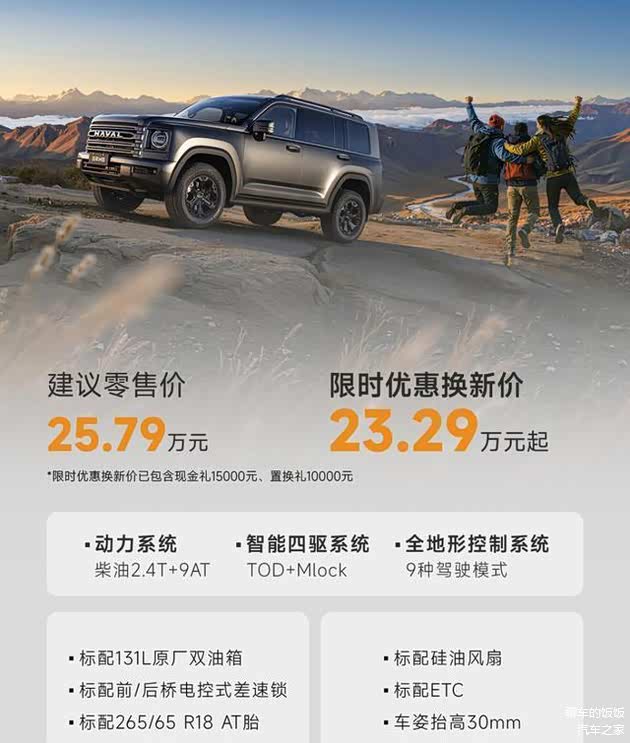 12月11日,哈弗硬派越野家族新成员——二代 哈弗H9穿越版正式上市,以“让每个人都能实现穿越的梦想”为核心定位,官方建议零售价25.79万元,限时优惠价仅为23.29万元起。