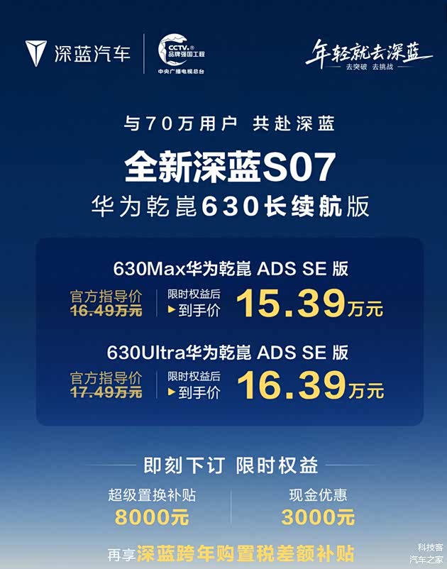 如今,全新深蓝 S07 华为乾崑 630 长续航版在成熟产品力基础上完成续航升级,进一步完善用车体验,弥补了纯电缺乏长续航版本的不足,如果你看重华为乾崑辅助驾驶、前排双零重力座椅、智能座舱、央企安全背书,它会是很好的选择。值得一提的是,双十二期间购车福利再加码用户不仅可享受至高价值 63361 元的 10 大超感礼包,涵盖现金优惠、超级置换礼等核心权益,还能参与双 12 抽奖活动,有机会赢取至高 10000 元购车券或 1000 元京东 E 卡,更可享受跨年购置税差额补贴,正是入手的黄金时机,切勿错过。