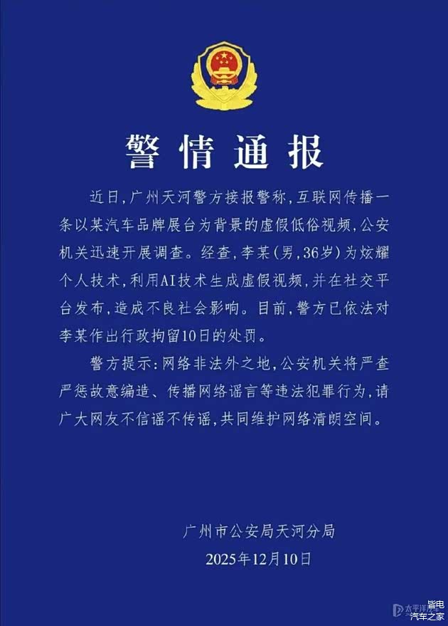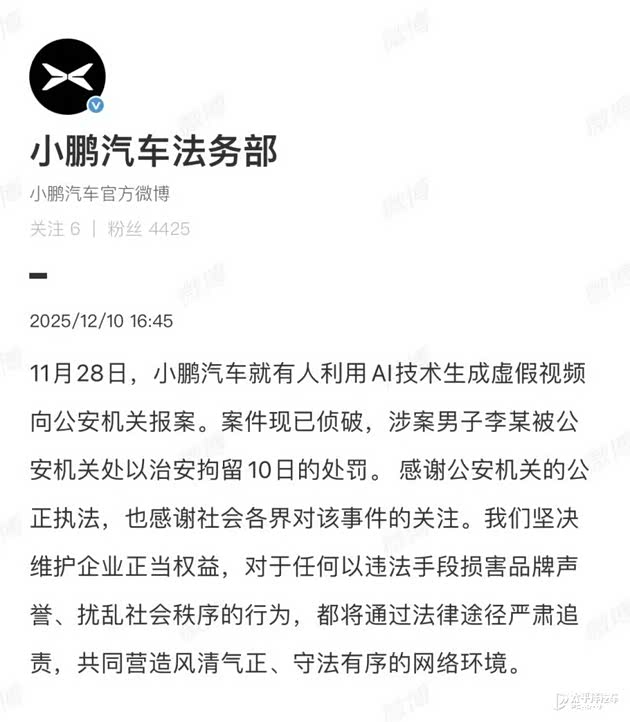 2025年广州车展期间,小鹏汽车就有人利用AI技术生成虚假视频向公安机关报案。12月9日晚,小鹏汽车法务部官方微博发布声明,该案件现已侦破,涉案男子李某被公安机关处以治安拘留10日的处罚。