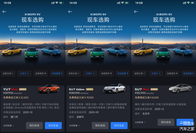 查询小米汽车APP可以看到,参与“现车选购”活动的车型集中在 YU7 Max、SU7 Max、SU7 Ultra三大版本上,价格因选配有所区别。