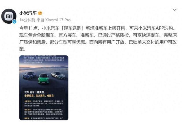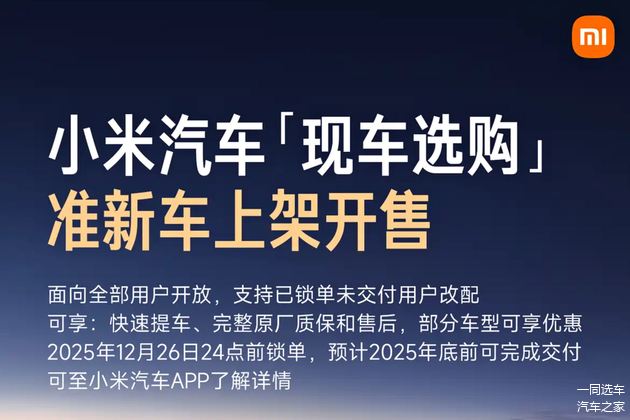 12月12日,小米汽车“现车选购”新增准新车上架开售,面向全部用户开放,支持已锁单未交付用户改配,可享完整原厂质保和守候,部分车型可享优惠,12月26日24点前锁单,预计2025年底前可完成交付。