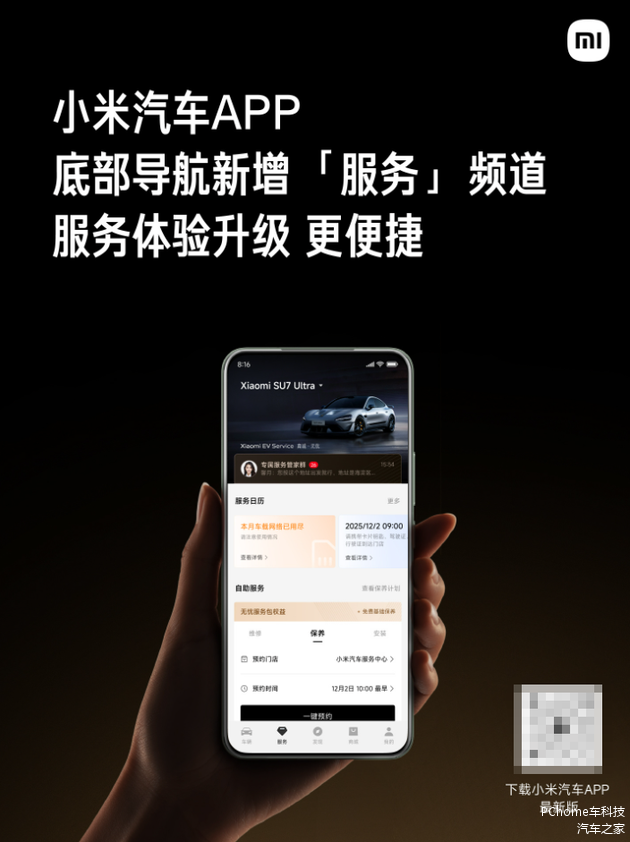 细节方面,小米汽车APP底部导航新增“服务”入口,管家群、预约保养、附近门店快速查看;新增“服务日历”智能提醒保养、续保等重要待办及时知晓;“自助服务”升级,可一键预约维修、保养、安装;专属服务管家群、权益中心搬家到“服务”频道。