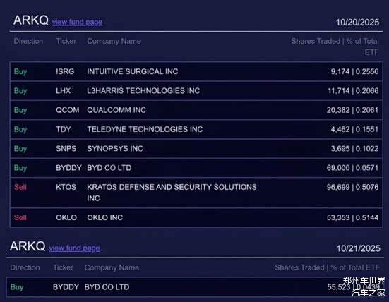 除国际投行外,以凯茜·伍德(女版巴菲特)旗下方舟投资为代表的长线资金,也在加速布局比亚迪。方舟投资在10月20日通过旗下ARKQ基金买入69000股比亚迪,10月21日再度增持55523股,这一连串的动作,充分表明了该资本对比亚迪前景的看好。