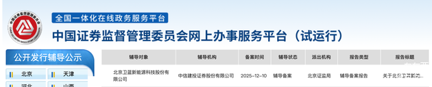 车东西12月12日消息,日前,中国证券监督管理委员会网上办事服务平台信息显示,北京卫蓝新能源科技股份有限公司与中信建投证券签署上市辅导协议,正式启动A股IPO进程。