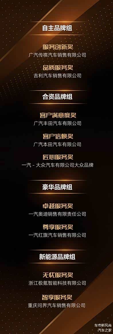 2025(第二十届)中国汽车金扳手奖评选共设置4个组别,分别为自主品牌、合资品牌、豪华品牌、新能源品牌,依据评选标准及评审结果,最终广汽传祺、吉利汽车荣获自主品牌组年度奖项,广汽丰田、广汽本田、一汽-大众大众品牌荣获合资品牌组年度奖项,一汽奥迪、一汽红旗荣获豪华品牌组年度奖项,极氪、问界荣获新能源品牌组年度奖项。