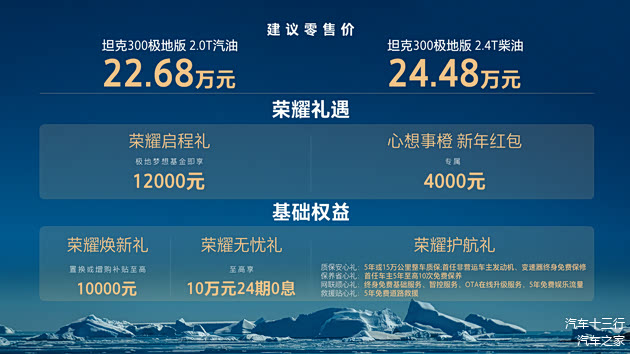 12月11日,在坦克300全球用户达成50万之际,坦克300极地版正式上市。官方建议零售价,坦克300极地版2.0T汽油22.68万元,坦克300极地版2.4T柴油24.48万元,并推出荣耀启程礼、心想事橙新年红包和多项基础权益等多重购车礼遇。