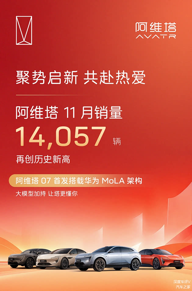 目前,阿维塔共推出了四款量产车型,分别为阿维塔06、07、11、12。品牌已形成纯电与增程双动力产品矩阵,覆盖20-70万元主流豪华市场,累计用户超22万。2025年11月销量达14057辆,同比增长21%;1-11月累计销量118302辆,实现连续9个月销量破万,增长势能稳定。从销量结构来看,阿维塔06与07作为走量车型,月销稳定在3000-4000辆区间,峰值超7000辆;阿维塔12月销维持在2000辆左右,随着四激光雷达版的上市,凭借更精准的智能感知与交互能力,销量已呈现回暖态势。