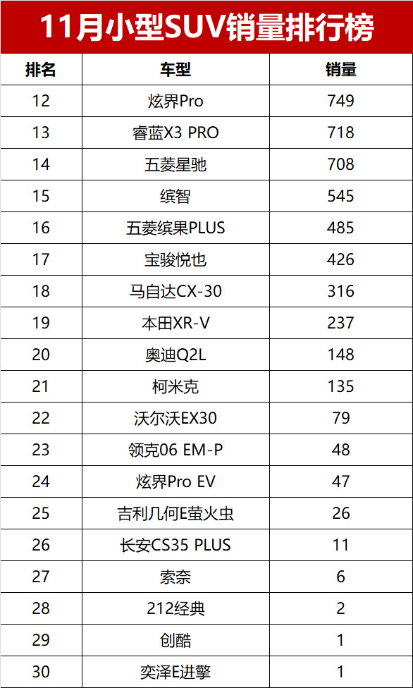 从榜单后半段开始,情况就显得有些“残酷”了。曾经叱咤风云的合资“双雄”——本田XR-V和缤智,本月销量分别仅为237辆和545辆,排在第19和第15位,早已不复当年之勇。豪华品牌方面,奥迪Q2L卖了148辆,排在第20位;沃尔沃EX30仅售出79辆,排在第22位,这些车型更多是品牌形象的补充,难以走量。