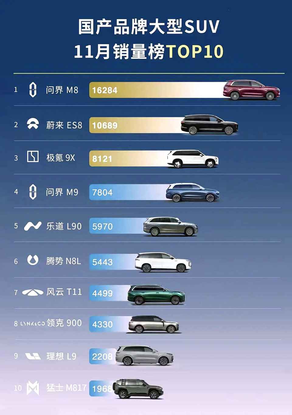 11月大型SUV销量排名再次洗牌,问界M8仍然排名第一,但万万没想到的是问界M9不再是第二名,M9可以说是国产车的奇迹啊,均价50万,月销一万多台,20个月交付26万台,长时间稳坐该价位段的SUV销冠,把bba打的一点脾气都没有,无奈的是问界m9最近两个月销量开始下滑,10月卖了8010辆,11月销量下滑到7804辆。