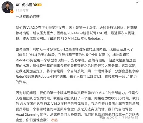 理想汽车的郎咸朋回应外界对VLA的质疑,何小鹏更是直接剧透VLA 2.0发布节奏,并再定与特斯拉的赌约。