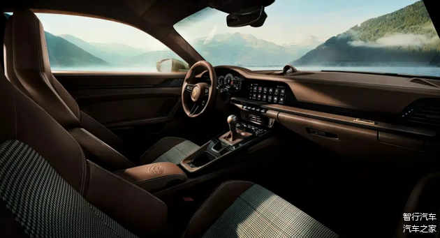 内饰部分采用精致的网格编织工艺,座椅选用松露棕皮革与织物拼接材质,仪表台处镶嵌一枚金色铭牌,刻有初代911轮廓剪影、开孔胡桃木材质的换挡杆,细节处尽显复古质感与专属身份。