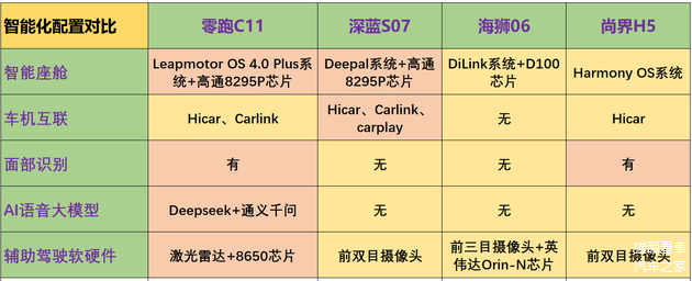 再看辅助驾驶:四款车这一方面其实做的都非常出色了,哪怕是入门级也给你L2级辅驾,不过15万价位上,像海狮06、深蓝S07和尚界H5均采用传统摄像头的纯视觉方案,也都能实现高速领航辅助、辅助泊车、遥控泊车等功能,零跑C11则是仅有的一个舍得把激光雷达+高通8650芯片的组合下放到15万市场的,总计28个智能感知硬件加持,可实现27项辅助驾驶功能,包括城区通勤领航辅助、记忆泊车、辅助泊车等,不管是高速跑长途还是市区堵车,都能帮着分担不少,雨雾天激光雷达的辨识度也高,安全性更有保障。