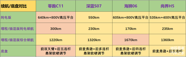 另外我再插几句话,咱们平时不管是日常通勤、跨城游,还是长途自驾游,尤其是满载情况下,肯定更在意前后排的乘车舒适性。那么这四款车都采用了前后独悬结构,除了尚界H5,就这个价位上其他三款车都额外提供悬架软硬可调,像零跑C11和深蓝S07还是后置后驱,自己开调的硬一点有驾控乐趣,载人时调的软一点更舒适;然后,零跑C11和尚界H5都是后五连杆独悬,相比海狮06的四连杆后悬、深蓝S07的传统多连杆后悬,可更好兼顾操控与舒适性,而且零跑C11还采用了双叉臂前悬,可通过增强横向刚度提升防侧倾性能。