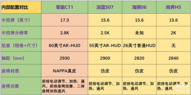 涉及到座椅功能方面,四款车都提供前排电动调节、加热、通风,以及二排靠背角度调节,深蓝S07、海狮06和尚界H5都是仿皮材质座椅,零跑C11则是NAPPA真皮座椅,而且多了前排座椅按摩、二排座椅加热通风功能,我觉得这几项倒是挺实用,开车时间久了可以通过按摩舒缓肢体疲劳感,冬夏季坐前后排的体感是无差别的;而深蓝S07可以通过手机APP远程开启前排座椅加热,尚界H5则支持车内语音控制前排座椅加热和通风(以上配置差异仅限于15万左右车型)。