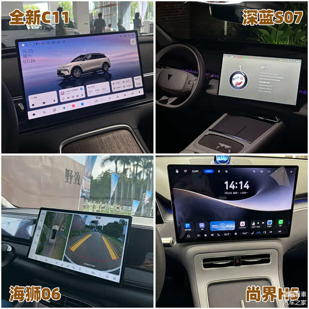 说完了外观,咱们来看看它们的内饰风格。它们都搭载中央悬浮式中控屏,而且深蓝S07、海狮06和尚界H5的尺寸都是15.6英寸,反观零跑C11则是17.3英寸规格中控屏,它不仅尺寸更大,2.8K分辨率也高于深蓝S07的2.5K和尚界H5的2K。