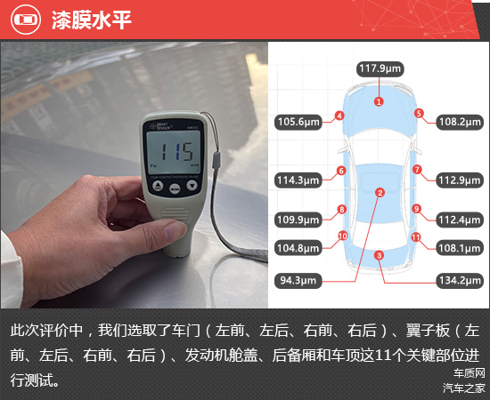 在漆膜水平测试环节,通过测试结果可以发现,整车漆膜平均厚度约为111.1μm,在测试过的同级别车型中处于中下游水平。从各关键部位的测试数据来看,除后备厢和车顶外,其余部位的漆膜厚度相差不大,漆面喷涂均匀性表现尚可。