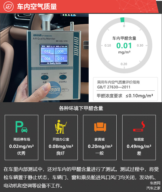 在车内空气质量测试环节,将车辆放置在车辆较少的内部地面停车场中,实测2026款吉利银河星耀6的车内甲醛含量为0.01mg/m3,符合2012年3月1日起实施的,由原环保部和国家质量监督检验检疫总局联合发布的《乘用车内空气质量评价指南》(中华人民共和国国家标准GB/T 27630-2011)中的相关标准。