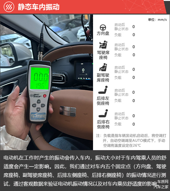 在静态车内振动测试环节,启动后静止和负载两种状态下,评测车所有测试位置在两种状态下的振动数值均为0,表现非常出色。