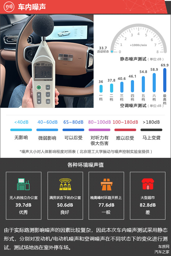 在静态噪声测试环节,评测车在启动状态下车内实测噪声值为33.7dB,在测试过的同级别车型中处于中游水平。由于评测车搭载插电式混合动力系统,启动状态下发动机默认不工作,因此无法对2000rpm以及3000rpm的噪声进行测试。