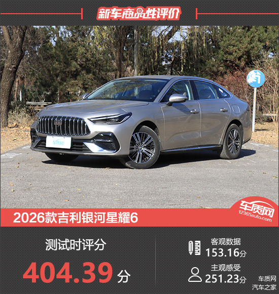 从以上各项测试结果得出结论,2026款吉利银河星耀6在客观数据和主观感受方面的整体表现达到了专家评审团预期。在客观数据层面,车身工艺和操控系统设计令人满意,但没有配备前驻车雷达,前后及外后视镜视野盲区较大,仍存在提升空间。在主观感受层面,“涟漪美学”设计令人过目不忘,座舱保持极简风格的同时兼顾使用便利性和实用性,乘坐体验舒适,人机交互顺畅。动力储备较为充沛,转向轻盈易操控。不足之处在于,发动机舱盖仅使用手动支撑杆,车内未提供手机无线充电板。综合来看,2026款吉利银河星耀6的商品性表现在测试过的同级别车型中处于中下游水平。