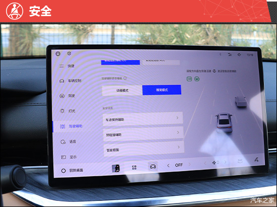 评测车支持L2级辅助驾驶,具备车道保持辅助系统、车道居中保持、道路交通标识识别等辅助功能。实测开启辅助驾驶后,跟车距离较远,较易被其他车辆加塞;红绿灯起步车辆无法自行跟随,需要驾驶者主动操作,整体能力相对基础。