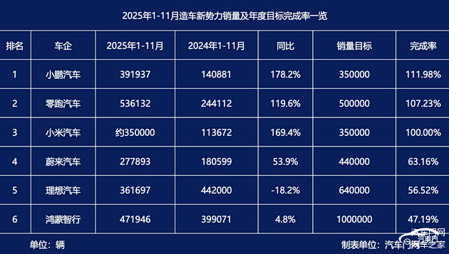 2025年临近尾声,又到了各大车企兑现年度销量目标的时候。其中,新势力们纷纷公布销量,有的新势力车企已经率先交卷,但一部分新势力车企与年度销量目标仍有较大差距。本篇就对新势力今年前11月销量和年度目标完成率进行盘点分析。