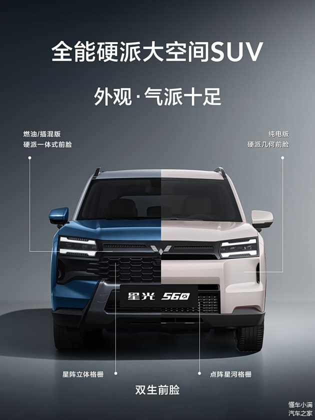 先来简单回顾一下外观设计,我觉得了解五菱的朋友对这款 星光560并不陌生,因为它在2020年成都车展首次亮相,当时它的名字叫做宏光侠,可没想到这一等就是五年。现在我们终于是迎来了量产版,二者在设计上保持了高度一致,均为硬朗风格,但也没有方盒子那么方正。另外值得一提的是,星光560因为有三种动力,因此它将提供两种风格前脸,插混和燃油为开放式蜂窝格栅,纯电版就是封闭式格栅。