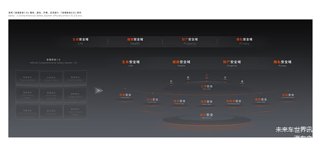 作为行业安全技术的先行者与引领者,吉利在“全域AI”技术体系的赋能下,以“AI为纲 责任为本”,基于原有的“全域安全”技术体系进阶打造“全域安全2.0”技术体系。结合智能时代的安全新需求和新挑战,“全域安全2.0”技术体系秉持“以人为尊”理念,通过技术升级、能力突破与范式创新,将侧重“整车安全”的视角升级为“人-车-路-云-星”的生态视角,旨在贯穿用户出行全场景、覆盖出行全领域、联动出行全生态;并以“生命零伤亡、健康零危害、财产零损失、隐私零泄露”四大安全愿景为指引,逐步构建的一套为消费者提供全面的安全保障技术体系。