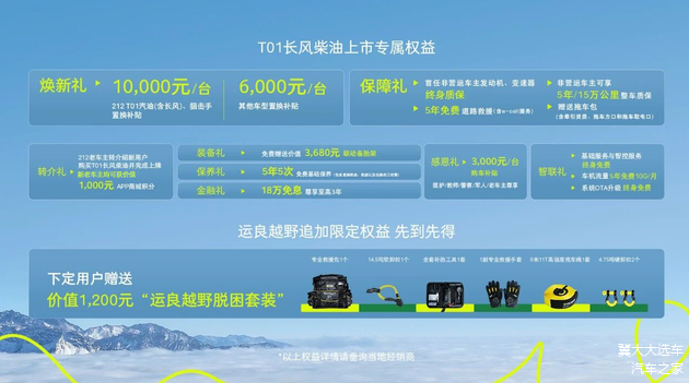 为提升用户全周期的越野用车体验,T01长风柴油推出了丰厚的上市权益:包括至高3年18万免息金融政策,5年5次免费基础保养,5年免费道路救援,以及联动备胎架及拖车包免费赠送;T01汽油版及狙击手老车主可享10000元置换补贴,其它车型可享置换补贴6000元;首任非营运车主可享发动机变速箱终身质保,非营运车主可享5年/15万公里整车质保;T01老车主介绍新用户购车,双方均可获得价值千元积分;军人、教师等特定群体额外享受3000元专属补贴。212越野车以实实在在的诚意,守护每一位用户向往远方的初心。