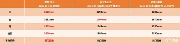 普通老百姓日常用车,空间还是很实用的,零跑T03的车身长宽高分别为3620mm、1652mm、1605mm,轴距长度为2400mm,同时采用五门四座的设计。相对而言,长安Lumin的车身长宽高分别为3293mm、1700mm、1545mm,轴距长度1980mm,奇瑞小蚂蚁的尺寸更小,长宽高分别为3200mm、1670mm、1550mm,轴距长度2150mm,关键是这两款车都是三门四座的设计。