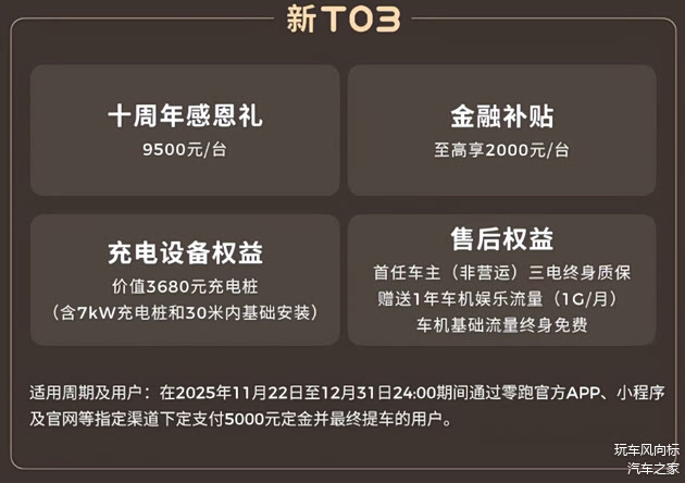 而且,零跑T03在12月份的优惠力度还挺大,9500元的现金优惠,就拿2025款 310 舒享版来说,310km的续航,裸车价只要5.04万,确实很香,还有2000元的金融补贴、免费充电桩/安装、三电终身质保、基础流量终身免费等政策,性价比了可以说是拉满了。