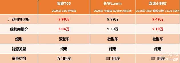 以上三款车的售价都在5-5.5万,加上保险,不到6万就能拿下,而且也都是比较受欢迎的明星车型,其中, 零跑T03的厂商指导价格为5.99万,目前有9500元的优惠,实际价格只有5.04万,加上交强险、商业险、上牌费用,全部办下来只要5.48万。相对而言,长安Lumin的厂商指导价格为5.89万,优惠后的价格为5.59万,小蚂蚁的厂商指导价5.49万,优惠后5.19万,两款车的定价都比零跑T03便宜一些,但是优惠力度比较小,落地的价格还要更高。
