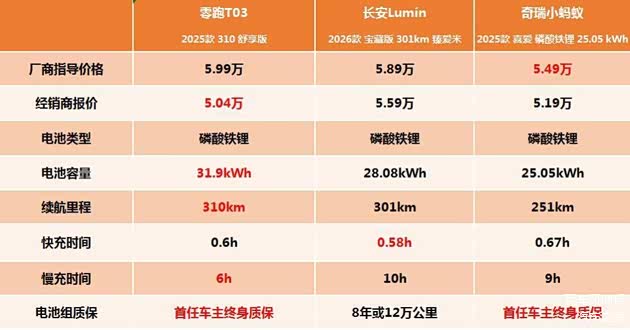 长安Lumin的续航里程也很不错,它搭载了容量为28.08kWh的磷酸铁锂电池,续航里程为301km,比零跑T03少了9km,虽然少不得不多,基本不影响使用,但是结合价格来看,性价比还是不如零跑T03。至于奇瑞小蚂蚁,搭载了25.05kWh的磷酸铁锂电池,续航里程只有251km,这个差距就比较大了。
