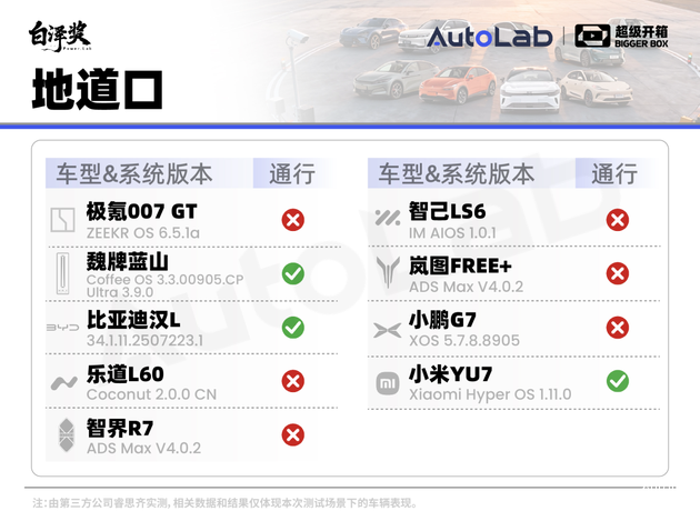 普通的转弯、直行对现在的城区领航来说,成功率都比较高。我们挑选出了一个比较难的地道口,考查九台车的差距。