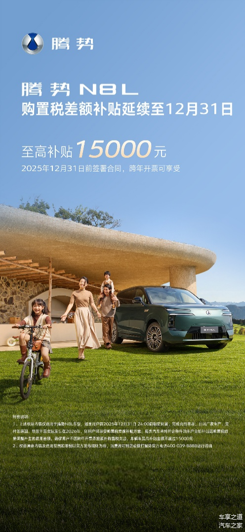 2026年日益临近,为应对新能源汽车购置税从全额免征调整为减半征收的政策变化,即日起,腾势汽车针对腾势N8L车型,正式推出购置税延续补贴政策,为消费者兜底,保证购车成本不会因政策变化而增加。