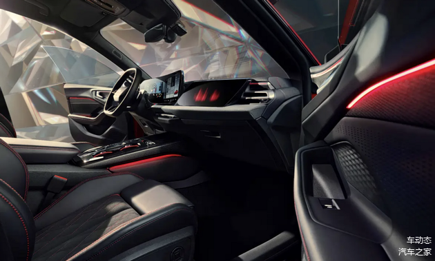 实际上,新车除了入门版之外,也提供“燃境红”的内饰配色,但和“竞速红”外观配色显然不同。新车内饰主要以黑色为主,大量超纤绒和超纤皮拼接组合,搭配红色缝线和竞速碳纤维饰板,运动氛围拉满。