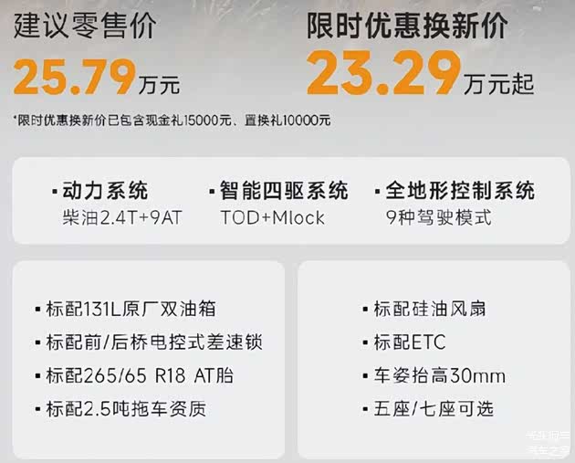 在20-30万价位区间,二代哈弗H9穿越版以“原厂合规越野配置+超大空间+1400km超长续航”形成绝对差异化优势。二代哈弗H9穿越版聚焦“拖家带口”的长途穿越需求。原厂标配的三把锁、双油箱、AT胎等硬核配置,不仅省去后期改装的高昂成本与合规风险,更规避了脱保隐患。限时优惠价23.29万元起,叠加现金优惠、置换补贴、超长质保等购车政策,性价比远超同级,让用户以更低成本享受“出厂即巅峰”的越野体验。