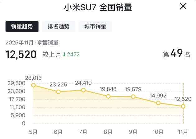 但是如今小米汽车也迎来了自己的销量瓶颈,尤其此前爆火的小米SU7已经连续多个月销量下滑,11月份小米SU7的销量已经下滑到了12000多辆!当然了12000多辆对比其他同级别车型销量也是非常不错的,但是对于小米汽车自己来说算是下滑的!