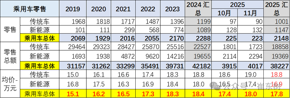 又拖后腿了!今年汽车均价17.8万!2019年乘用车零售均价是15.1万元,一路上升到2023年均价是18.3万元,2024年乘用车均价是18.4万元,2025年1-11月乘用车均价是17.8万元,较2024年均价下降0.6万元,其中11月乘用车均价18万元,均价提升。前期常规燃油车价格持续上升,市场萎缩在中低端很明显,而高端萎缩慢,因此从2019年的15万元上升到2023年的18.3万元。2025年随着高端燃油车的较快萎缩,2025年1-11月的均价降低到18.8万元,11月19万元,燃油车购买群体买车逐步稳定。而新能源车的均价近期逐步下降,从2023年的均价18.4万元,下降到2024年的均价18万元,2025年的均价16.9万元,目前2025年11月是17.4万元,价格下降明显,体现新能源车消费的活跃。