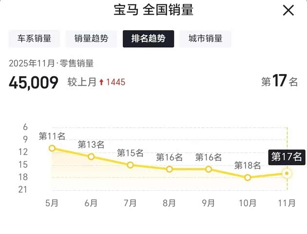 但别急着喊“真香”。价格跳水背后,是宝马X3销量连续数月低迷,今年4月一度跌至2742台,连奥迪Q5L的一半都不到。宝马品牌的整体销量排名也每月下降。面对国产新能源的围剿和消费者对电车的转向,宝马只能“断腕式”降价求生。