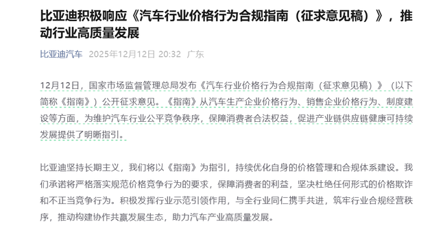 从 2025 年 12 月市场监管总局发布《汽车行业价格行为合规指南(征求意见稿)》,到比亚迪当晚便通过官方渠道表态响应,这家新能源汽车龙头的 “快速反应” 并非偶然。其背后是技术自研构建的硬实力、长期主义下的合规基因,以及全球领先地位赋予的行业责任感,三重底气共同支撑起比亚迪的 “率先行动力”。