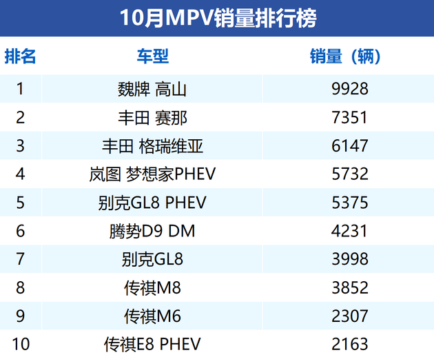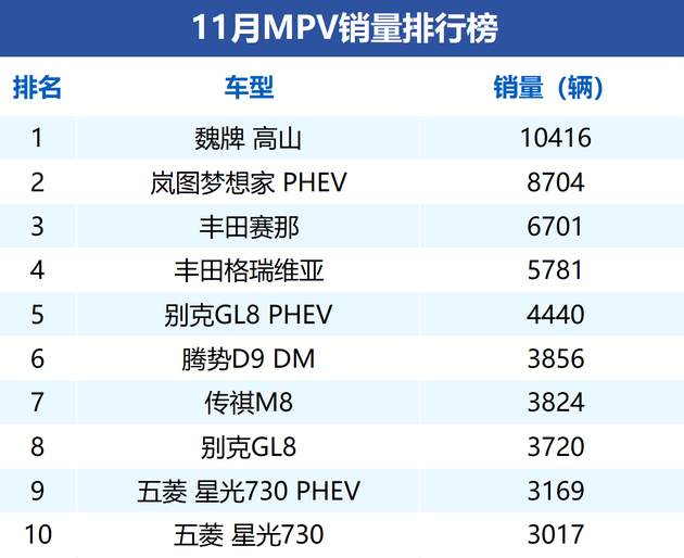 尽管MPV市场没有轿车和SUV那么大,但新车也是一款接着一款,市场竞争情况十分激烈。MPV冠军宝座也是经常易主,今年的MPV市场已进行了多轮洗牌,各大车企各显神通,MPV市场里也很难有常胜将军了。今年11月的销量排行榜中,魏牌高山再度夺得MPV销冠。