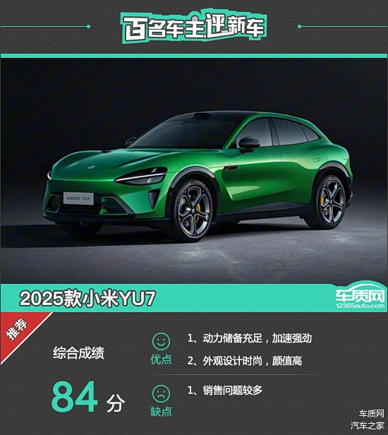 在收集到的103份有效问卷中,根据车主对2025款小米YU7在车型基本面、驾乘感受、使用成本以及质量可靠性、售前/售后服务方面给出的真实评价,在此次调查中2025款小米YU7的综合得分为84分,达到了车质网的推荐标准。