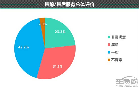 不过,在售前/售后服务总体评价中,接受调查的车主还是给出了客观的评价,其中认为“非常满意”的车主占比为23.3%;认为“满意”的车主占比为31.1%;认为“一般”的车主占比为42.7%;明确表示“不满意”的车主占比为2.9%。