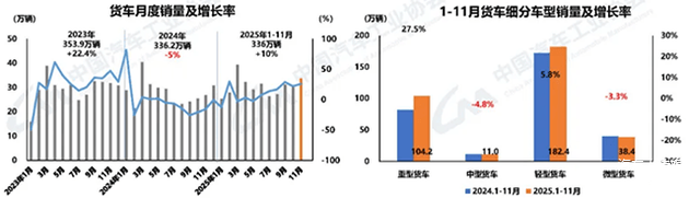 1-11月,货车产销分别完成333.5万辆和336万辆,同比分别增长11.4%和10%。其中,重型货车销量104.2万辆,同比增长27.5%;中型货车销量11万辆,同比下降4.8%;轻型货车销量182.4万辆,同比增长5.8%;微型货车销量38.4万辆,同比下降3.3%。